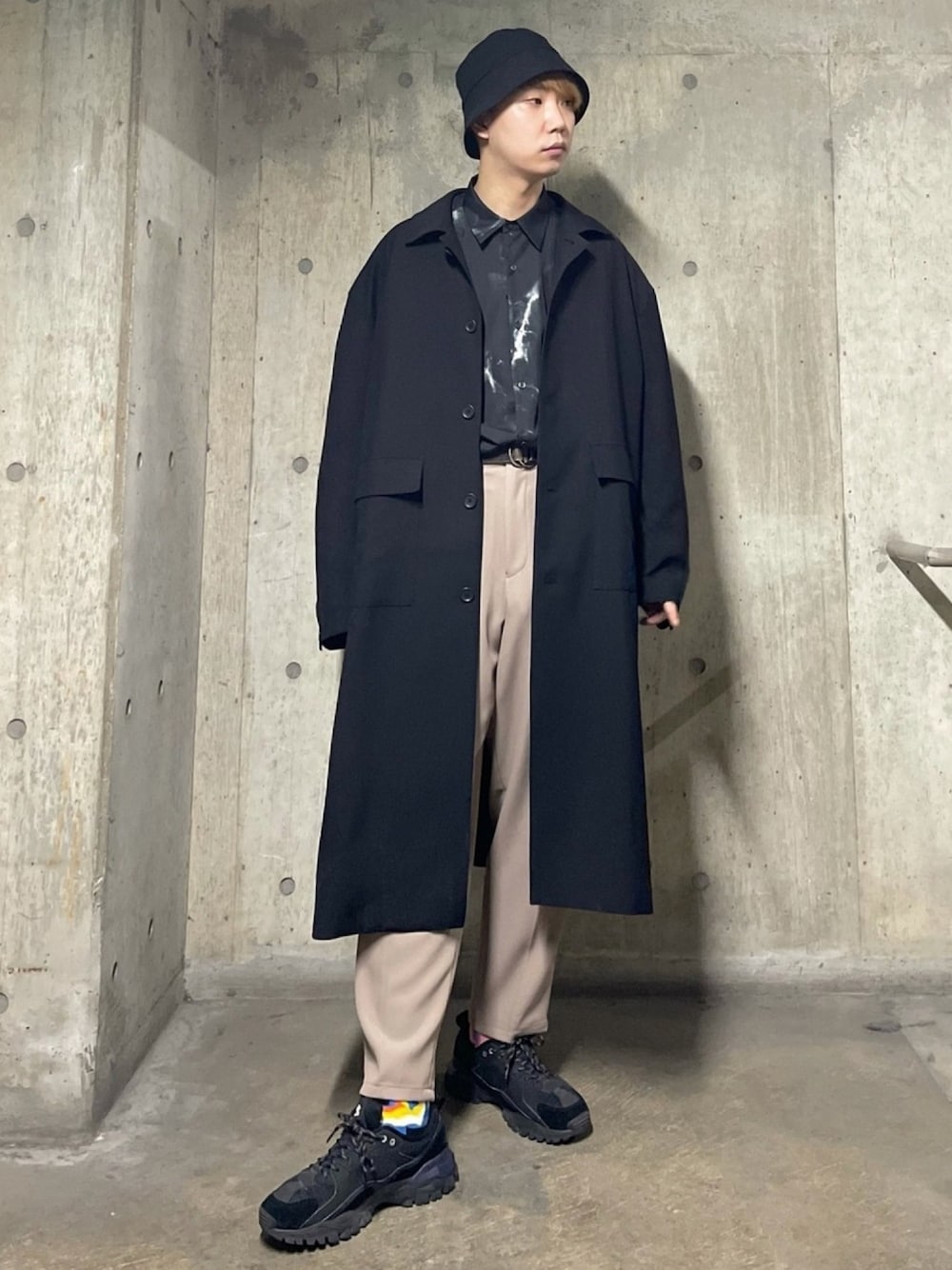 ーブラックステンカラーコート×ブラウンワイドパンツー ブラック系のアイテムにパンツだけ明るめのブラウンで合わせたモードなコーディネート。 オールブラックでもいいですが、春なので1アイテムだけ明るめのカラーを入れて春らしさを。 ステンカラーコートはこの春持っていて損はないアイテムです。 JUNRedでも色々なカラー、シルエットのご用意がありますが、ブラックは間違いないかと。 パンツだけではなく、インナーも明るめのカラーを入れるとより春らしさも増します。 全体的にゆったりめのアイテムで合わせるとバランス◎ ーーーーーーーーーーーーーーーーーーーーーーー 着用サイズ(身長:177cm) アウター:L インナー:L パンツ:L