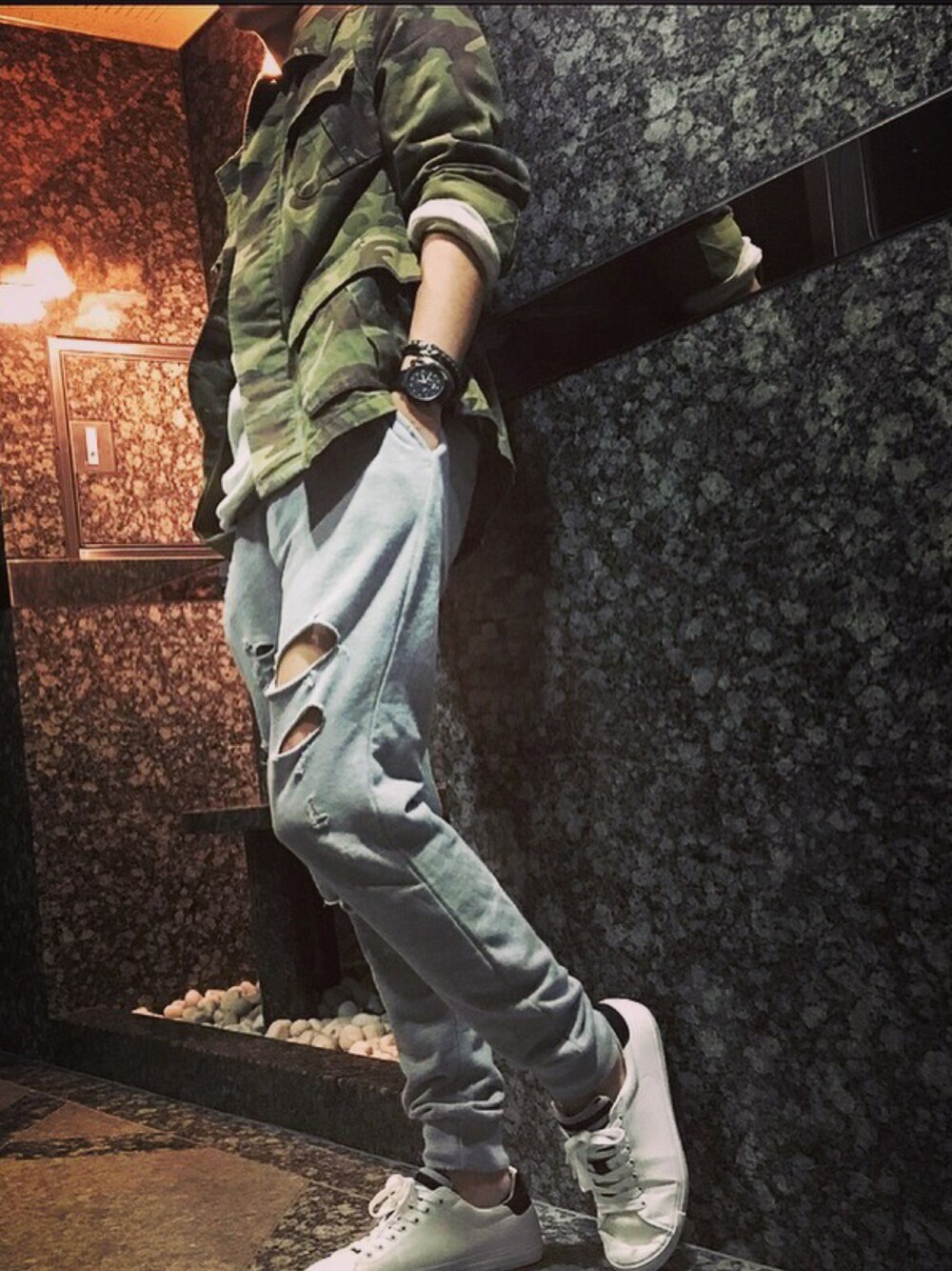 グレー系のその他パンツ、ホワイト系のスニーカー、ブラック系のアナログ腕時計を着用したメンズの春コーディネートの1枚目の写真