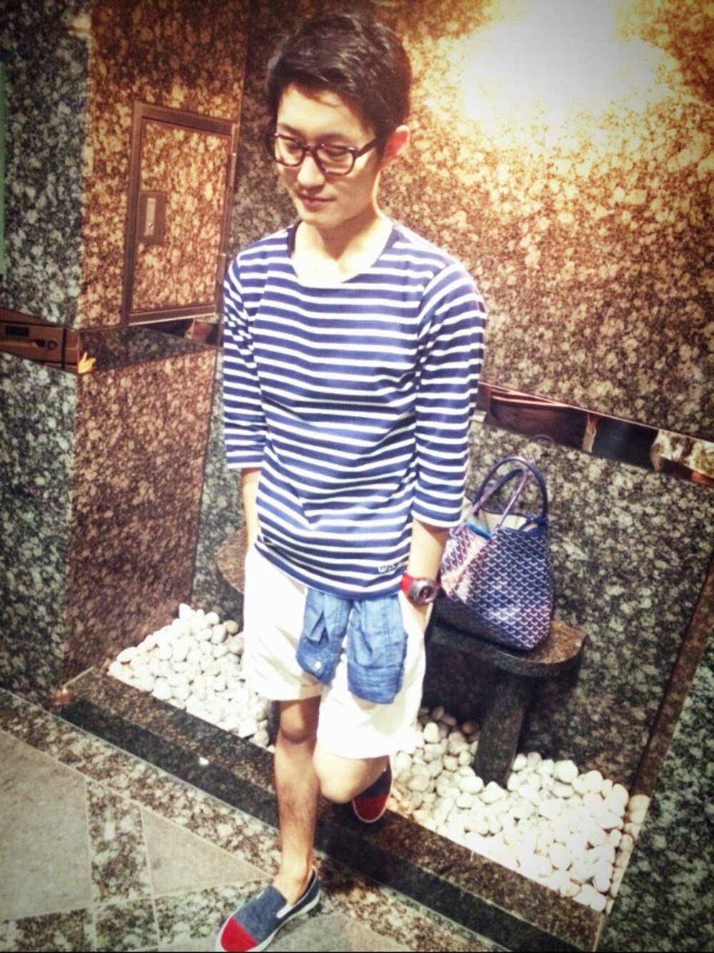 スリッポン: マカロニアン 時計: G-SHOCK 白ショーツ×ボーダーで爽やかに 腰巻きにデニムシャツ 時計とシューズでさらっとさし色