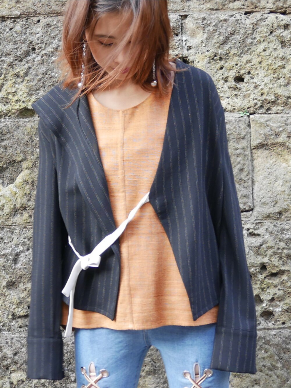 テラコッタのリネントップスと ピンストライプのラップシャツ 全てオンラインショップで購入可能です