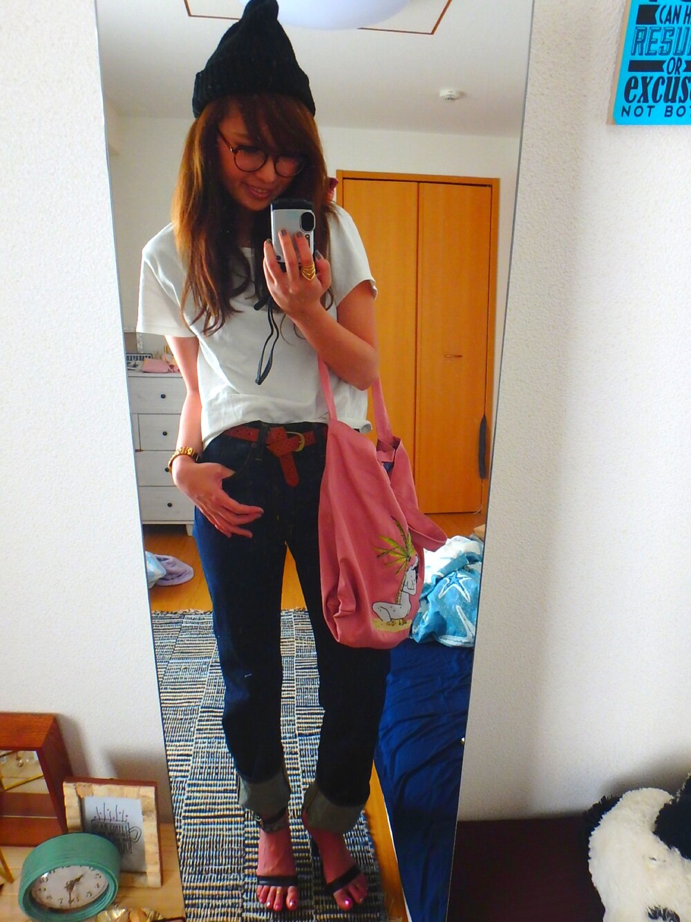 太めのストレートデニム😎😎めんずすぎるからヒール👠 サノバチーズ?のカバン 友達もってて一目惚れして 速攻買いに行った💗(笑) ベルト写メで伝わるかな?😭