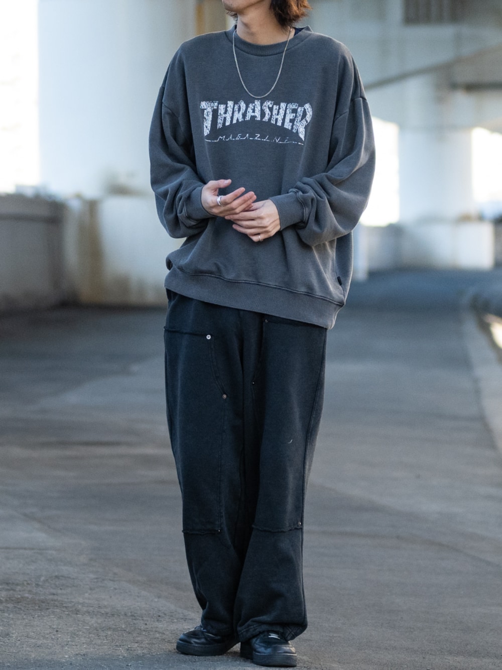 ます(JOHN'S CLOSET)のスウェット「【at】〔THRASHER/スラッシャー〕ピグメント加工 かすれロゴ クルーネックスウェット」を使ったコーディネート