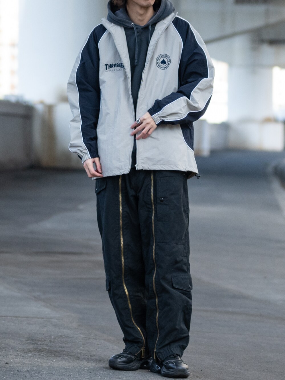 ます(JOHN'S CLOSET)のナイロンジャケット「【at】〔THRASHER/スラッシャー〕フロントロゴ ナイロン トレーニングジャケット/トラックジャケット」を使ったコーディネート