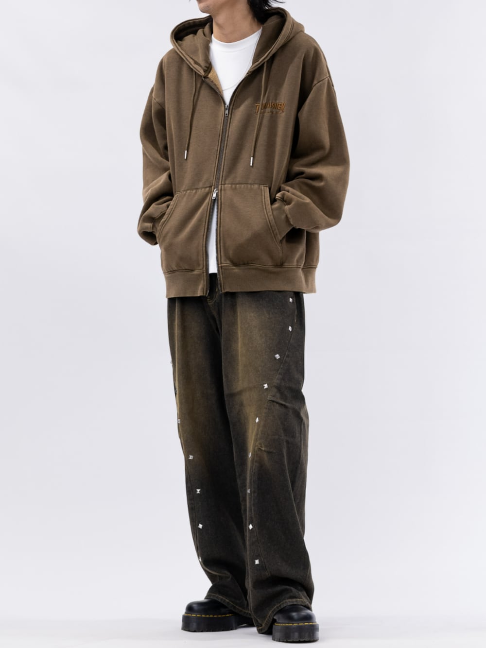 ます(JOHN'S CLOSET)のパーカー「【at】〔THRASHER/スラッシャー〕裏起毛 ワンポイントロゴ ピグメント ダブルジップパーカー」を使ったコーディネート