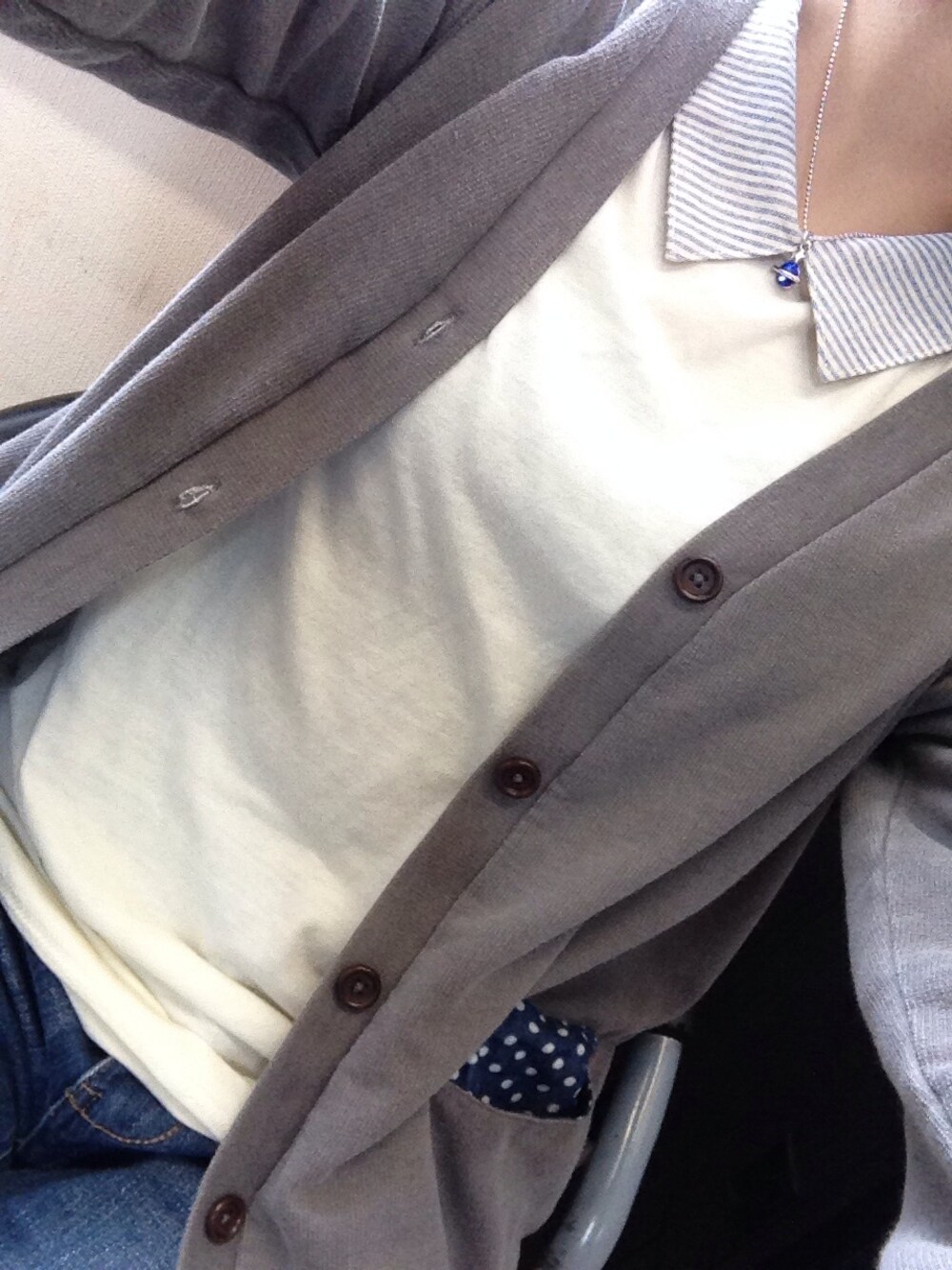 ベージュ系のTシャツ/カットソー、グレー系のカーディガン/ボレロを着用したレディースの冬コーディネートの1枚目の写真