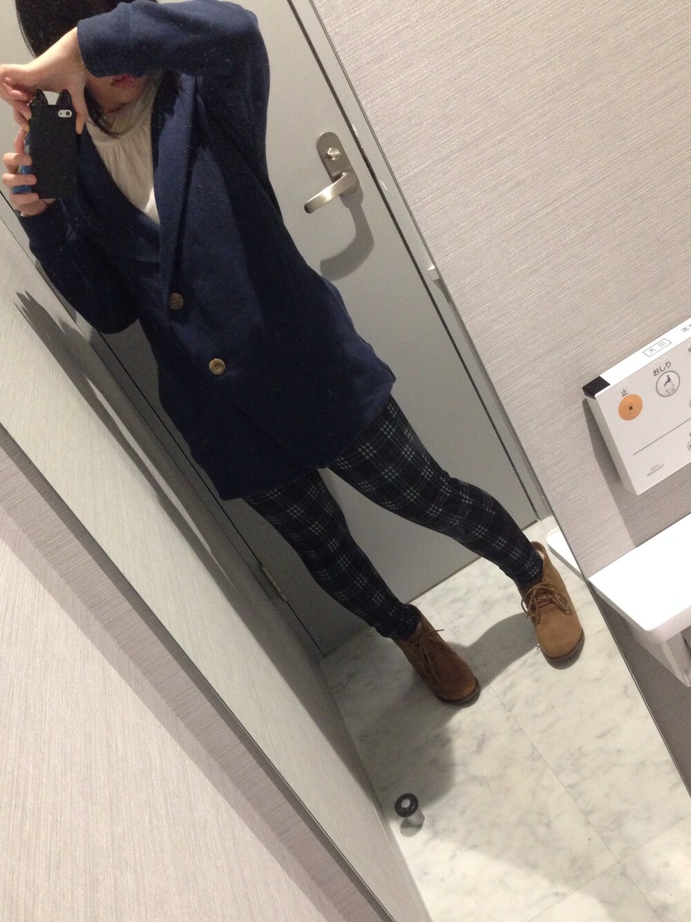 ブルー系のテーラードジャケット、ベージュ系のブーティを着用したレディースの冬コーディネートの1枚目の写真