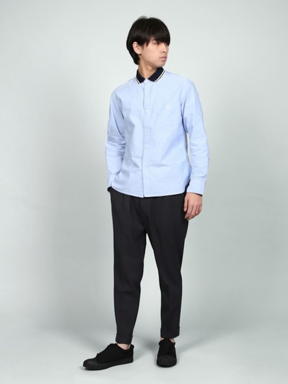 DUFFERの“GREENY”SIDE LACE SNEAKERSを使ったコーディネート。 パンツとスニーカーの色を合わせシャツの爽やかさを際立たせたスタイリング。 襟リブもアクセントに。