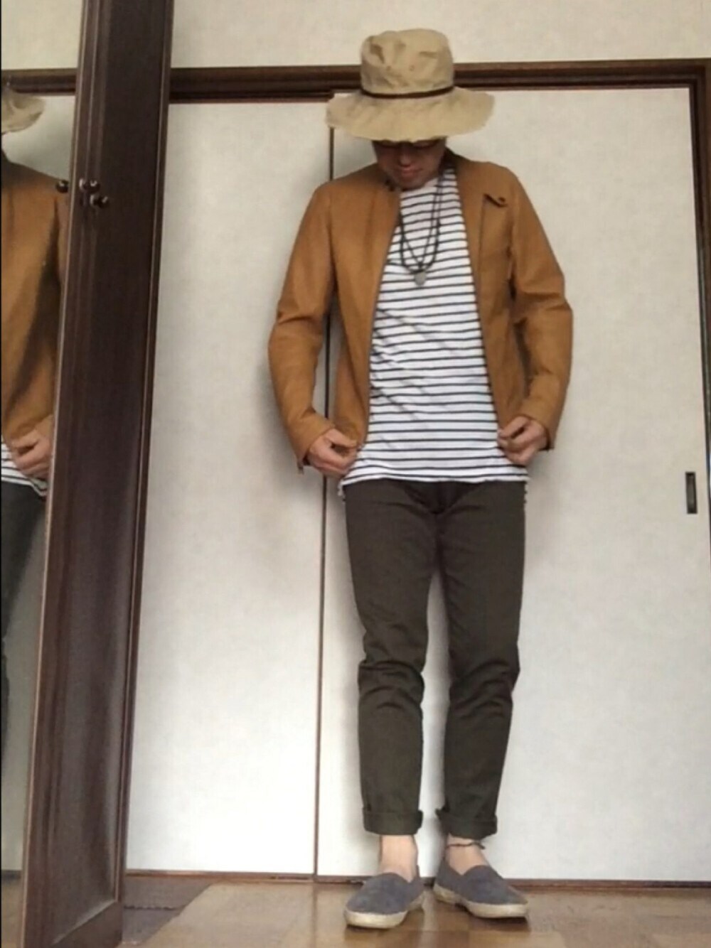 なんだか昨日の夜は肌寒かったぁ〜 なので薄手のライダース羽織ってて大正解‼️ このライダースは柔らかくて薄手なので春秋に助かるアイテムです😆 それに大好きなカーキのパンツをロールアップしてエスパを合わせるゴチャゴチャコーデ😂 今日も天気がハッキリしないっすねぇ〜