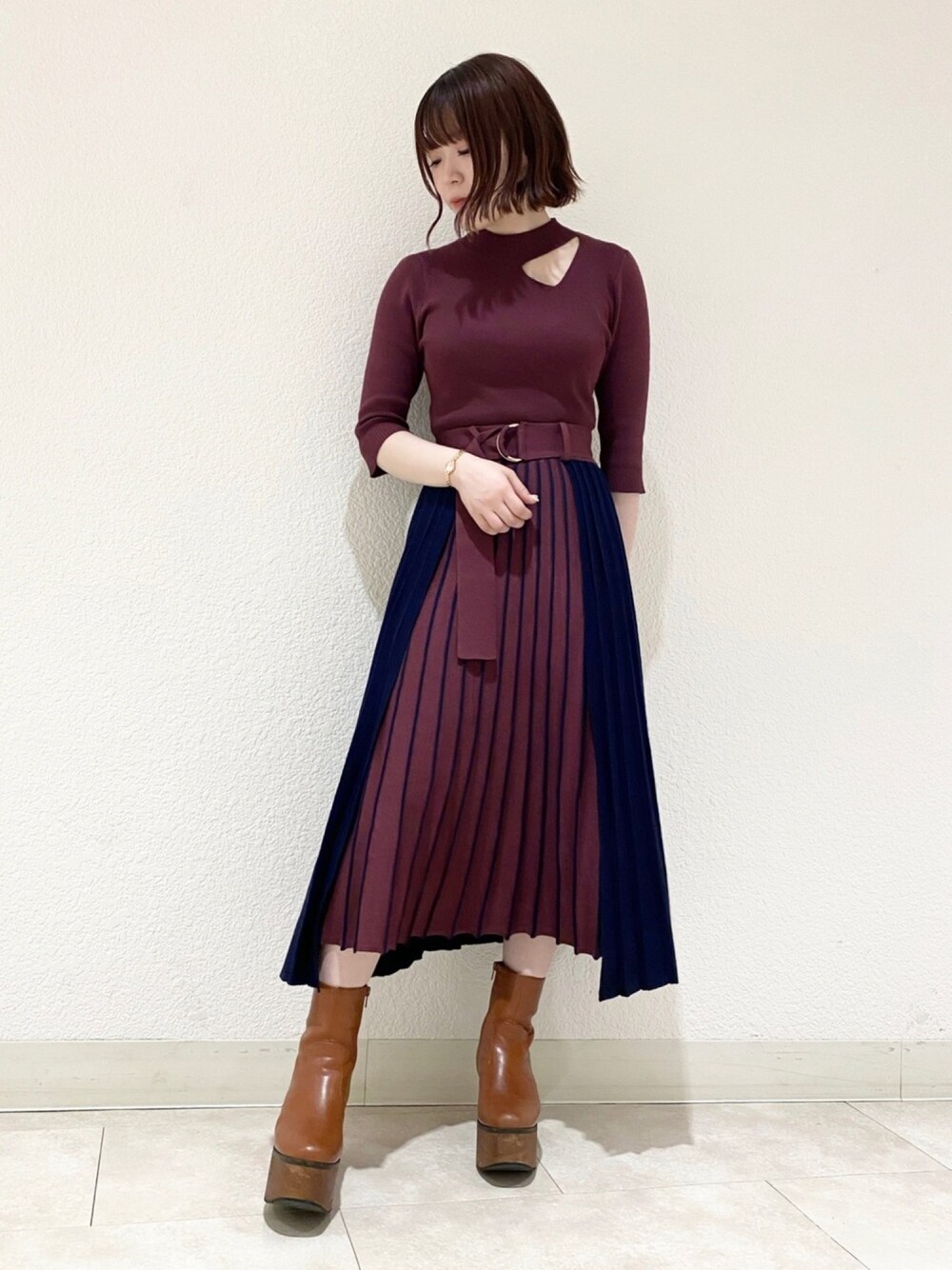 rihoのワンピース「デコルテ開きプリーツニットセットアップ」を使ったコーディネート