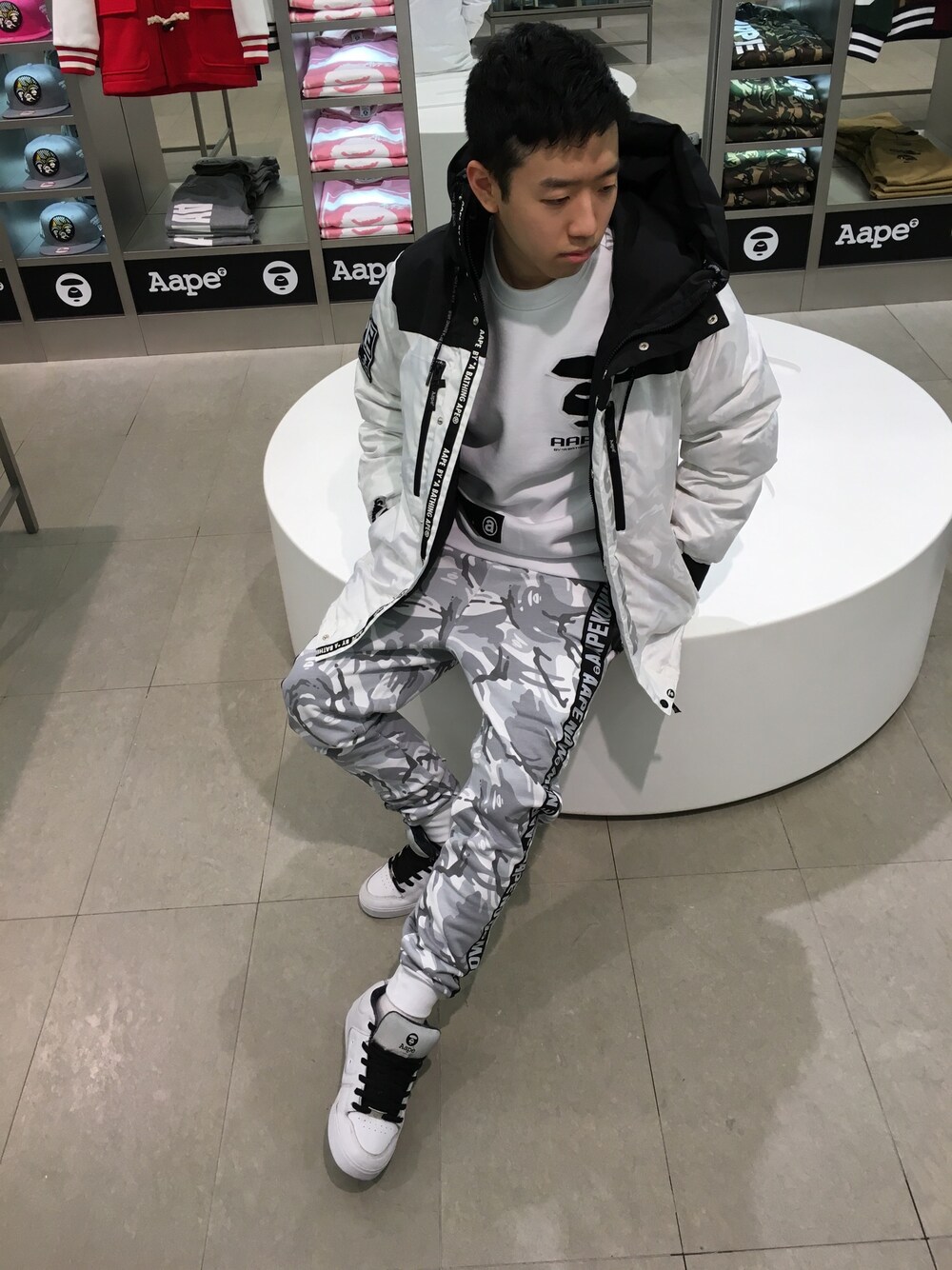 ダウンジャケットにスウェットパンツといったシンプルでラフなスタイルにホワイトカモ柄をテイストすることで冬らしさを強調してみました。