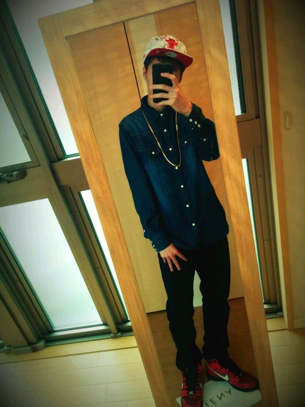今回は最近お気に入りのブルズのキャップとデニムシャツで定番ストリートファッションにしてみました笑