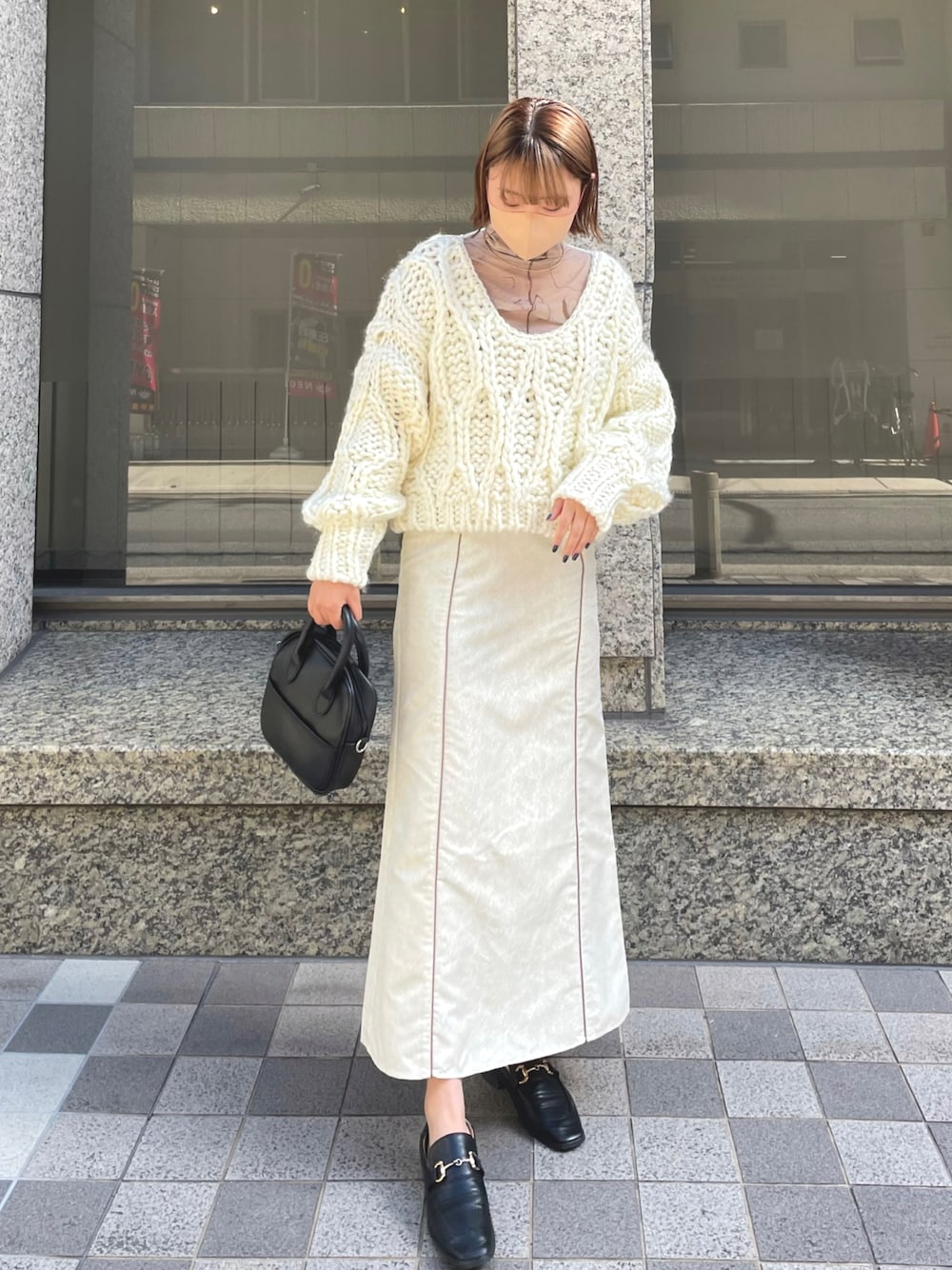 ご覧いただきありがとうございます🥨 CLEIOアイテムでオールホワイトコーデにしてみましてた🤍 厚手のニット上半身にボリュームがあるので、下はタイトのスカートを合わせて、バランスをとりました♩ 真っ白すぎないように、首元にマーブル柄を入れたのがポイントです!
