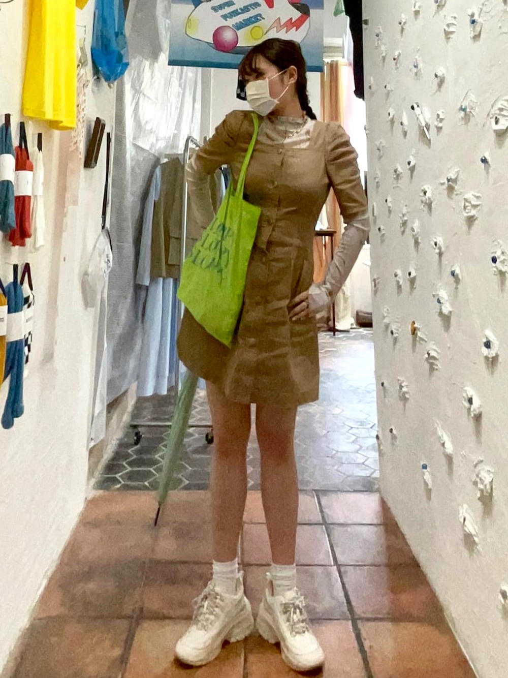 ご覧いただきありがとうございます♪ お気に入りのCLEIOのマーブルシアートップスを中に着込んで明るいコーデに仕上げました🌷 最近足元は白のごつめスニーカーにハマっているので、差し色でカジュアルに👟