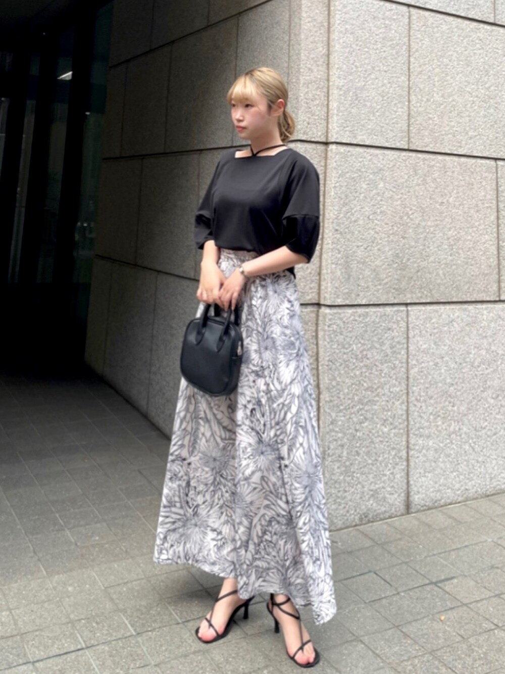 女性らしいボリューム感のあるフレアスカートに人気のランタンスリーブプルオーバーを合わせました🌱 ボタニカルフラワー側が印象的で存在のあるデザインなので、トップスは無地でバランスをとりました♡