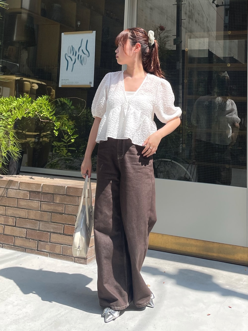 rkk(CLEIO)のシャツ/ブラウス「【CLEIO】Vネックパフスリーブシアー半袖ブラウス/V-NECK PUFF SLEEVE SHEER BLOUSE/293-11642」を使ったコーディネート
