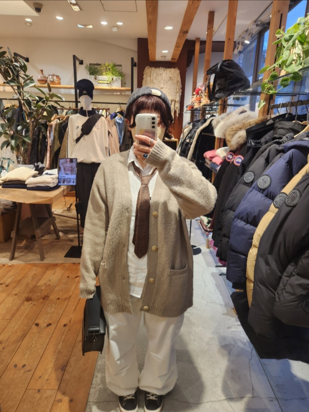 ネクタイを目立たせるためにきれいに見える白、ラフさとかを出すために白に似たぼかす系のメンズのカーディガン、カーゴパンツ、もっとかたくなりすぎないようにグレーのニット帽でかたくなりすぎないネクタイファッション(のつもり)