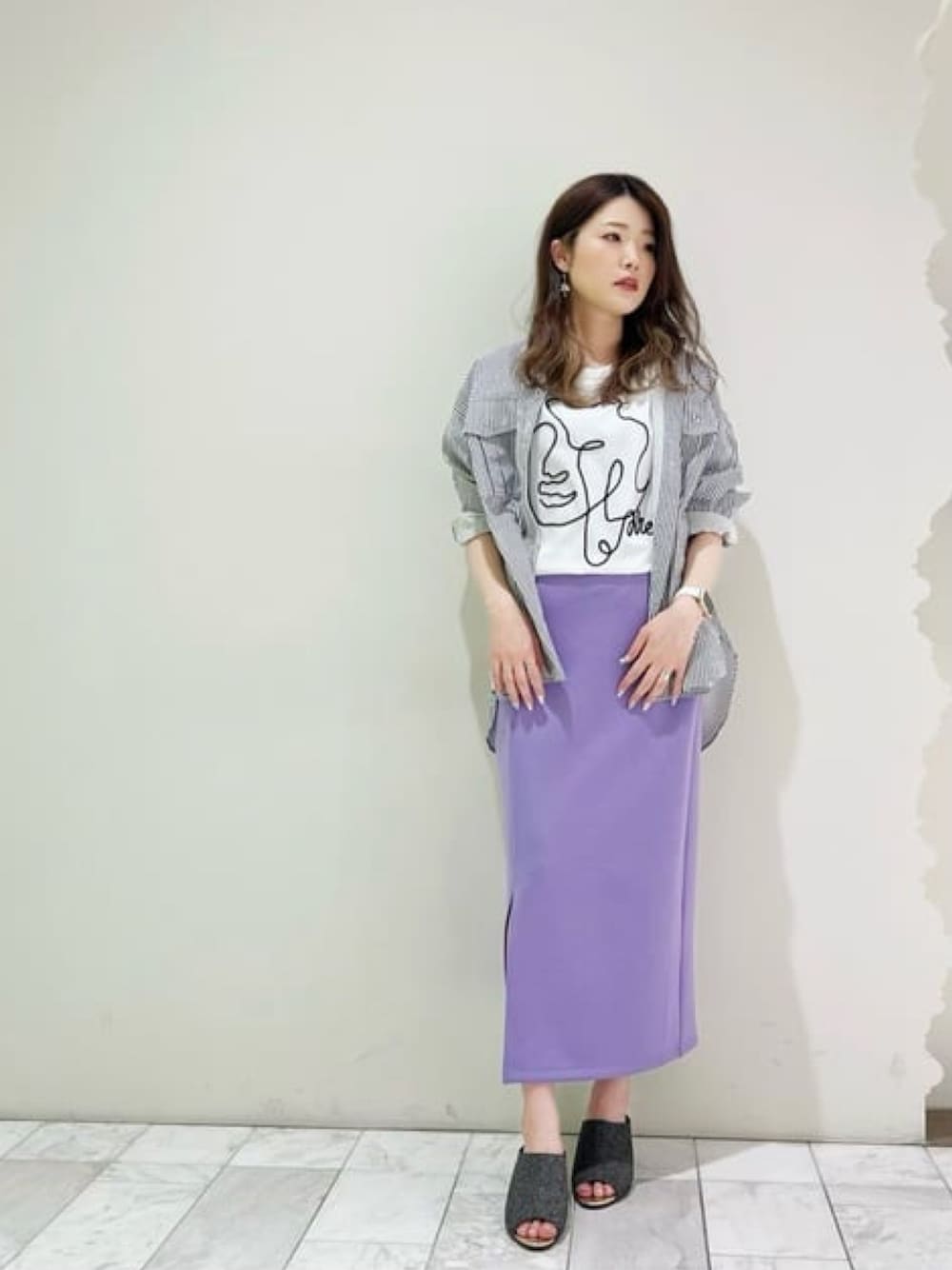 身長162cm 《Tシャツ》 ロープで描く女性の顔のデザインがおしゃれなTシャツ^^ しっかりした生地で型崩れしにくいです! 丈感もインに使いやすい長さ! 《サファリシャツ》 二重織りなのでこちらもしっかりしております。 しっかりしているのに柔らかい^^ カッチリ着るのもok、襟を抜いてラフに羽織るのもok! サイズ感は私だと少しオーバーサイズに着られる感じでした! 中太のストライプがかわいい^^ 無地のサファリシャツだとインナーに柄物を入れてもおしゃれですね^^ 《スカート》 アシンメトリーにスリットが入ったタイトスカート。 ダンボール素材なので肌触りが柔らかくふわふわです^^ ストレッチストレッチストレッチ!というほどストレッチがきいているのでしゃがみの姿勢も楽〜にできます! お色はパープル、イエローがかったグリーン、ブラックの3色。柔らかいカラーなのでカラーボトムスに少し抵抗のある方もチャレンジしやすいのでは^^