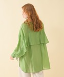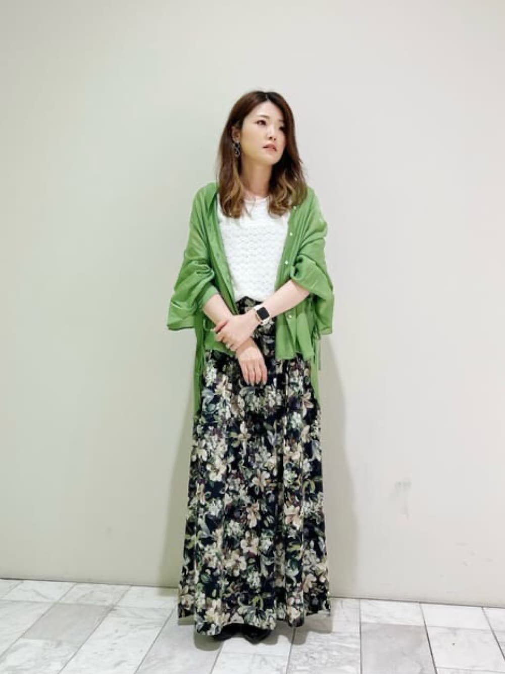身長162cm 《タンクトップ》 フロント幾何学模様のレースタンクトップ! このコーデではインしていますが、出していただくとお裾がレースで透けてかわいいです^^ 長さも丁度よくAラインでシルエットがきれい! 見せるインナーにもってくるとシンプルなタンクよりおしゃれさUPです^^ 《ブラウス》 大きなフリルがバックスタイルを引き立ててくれるブラウス^^ メインでも!前を開けてアウターとしても! 透け感がある軽やかな素材なので重くなりません^^ サイドのさりげないリボンとお袖のシャーリングがかわいい…! グリーンですとコーディネートを鮮やかに引き立ててくれます^^ お色違いの白は、色物と合わせていただいても◎ 《スカート》 mallaの総花柄ロングスカート^^ 同柄でトップスもあるのでセットアップでも着ていただけます。 後ろゴムでウエスト楽ちん! 柄の色彩がなんともいえないお色で上品なスカートです^^ しっとりとした生地なので、広がらずすとんとしたラインでスタイルUP^^
