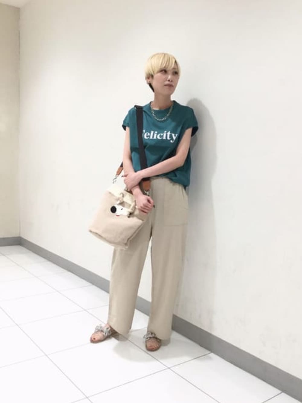 身長162cm トップス 首の開きと腕の肌見えがTシャツでも綺麗めで見えるデザイン しっかりした生地感でインナーを拾いません パンツ 麻混んでベタつき感なし ベージュも透け感気にせず履けます◎! 軽く涼しく夏にぴったりの楽ちんおすすめ ワイドパンツ バック 大人可愛いスヌーピーバッグ マチがしっかりついており、ショルダー付き