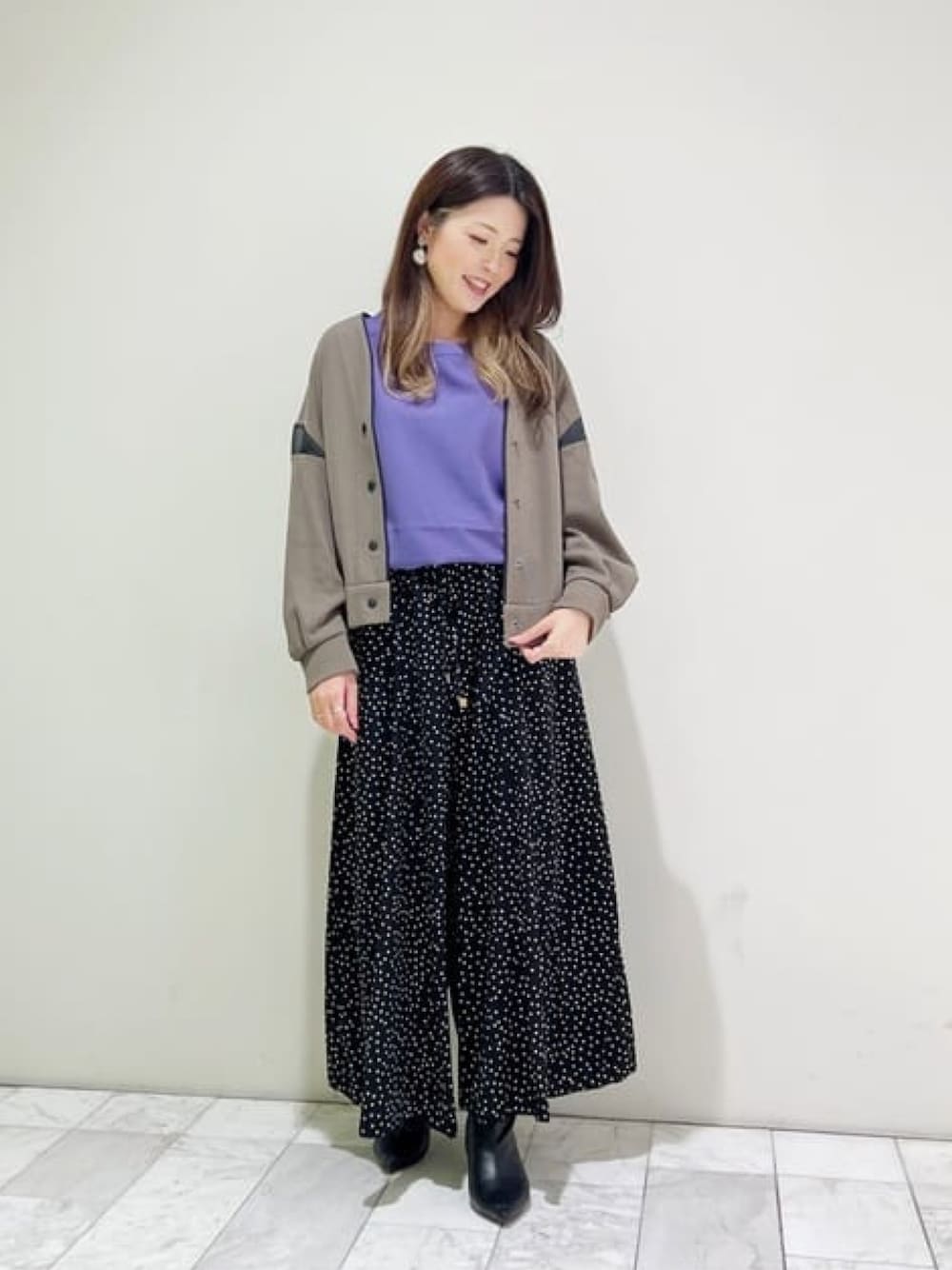 身長162cm 《トップス》 お袖が秋らしいサテン地のトップスです。 5分袖のボリュームスリーブでかわいい^^ 地味になりがちなオータムウェアの差し色に鮮やかなパープルがきれいです! 軽くゆったり着ていただけます^^ 3色展開でベージュと黒もあります! 色違いで揃えても使いまわせるアイテムです! 《パンツ》 細かいランダムドットが可愛いフレアパンツ! とろみのある生地でとにかく肌触りさらっとはきやすいです^^ ウエストもゴムと紐で調節可能が嬉しいですね^^ 《カーディガン》 ショルダー部分のシアー使いのデザインがかわいいカーディガンです! リブで柔らかく着ていただけます^^ 秋に大活躍間違いなし^^ フロントはスナップボタンです!!