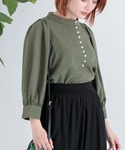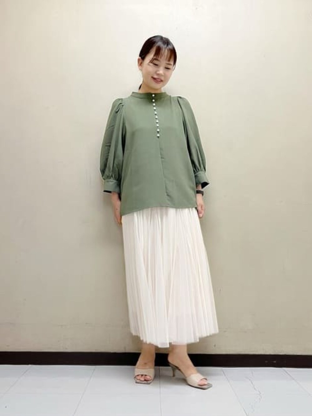 身長154cm 【ブラウス】 今年トレンドのパールモチーフ。スタンドネックですが、詰まりすぎず着易かったです。 【スカート】 通年履けるチュールスカート。生地のボリュームがしっかりあるのに広がりすぎない所が気に入ってます。