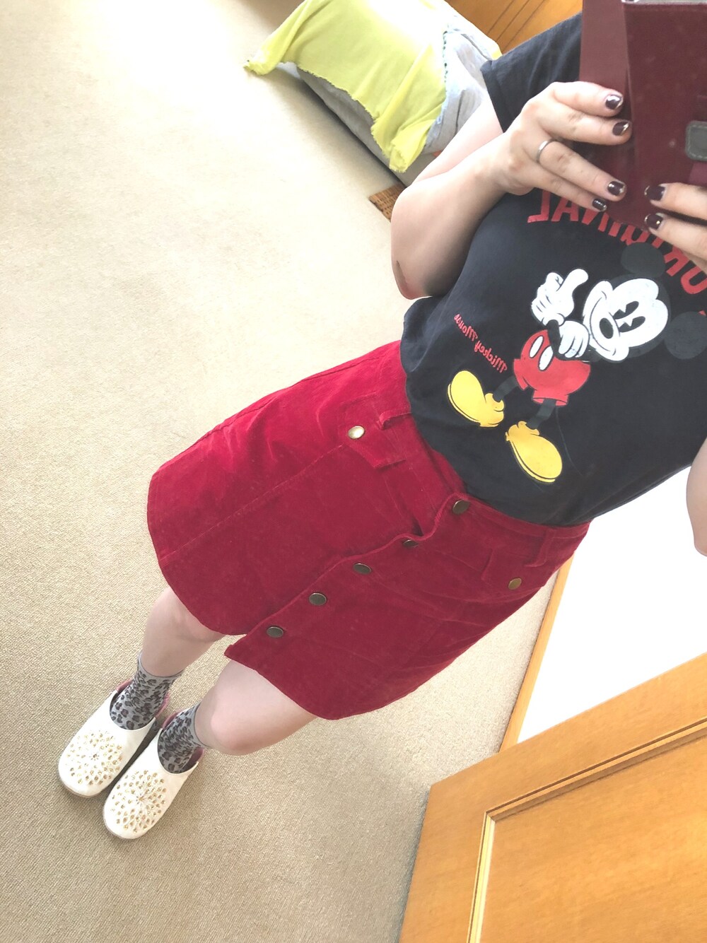 プチプラコーデ💓🍫 プチプラ大好きです😘 ミッキーのTシャツは可愛くて 即買いしてしまいました☺️ 少し秋っぽくなってきましたね🍁 このスカートは、コーデュロイ生地になっていて、派手な色ですが、合わせやすくてお気に入りです💝 早くセーターとか着たいなぁ〜😂