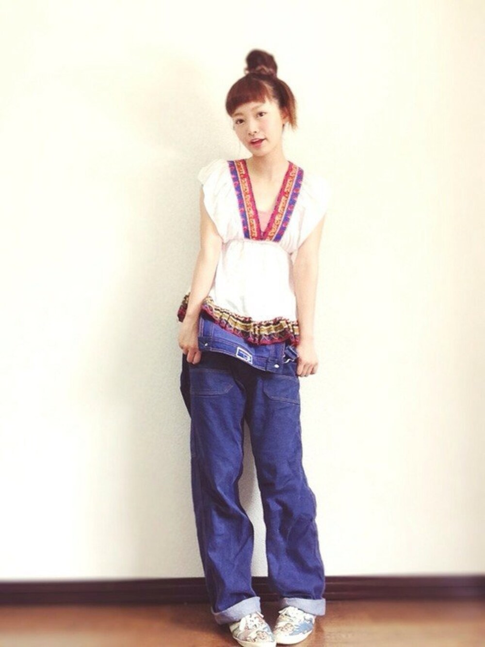 オーバーオールをベルトでとめて腰パン風に着てみました。 トップスはアジアン雑貨で安く買いました。