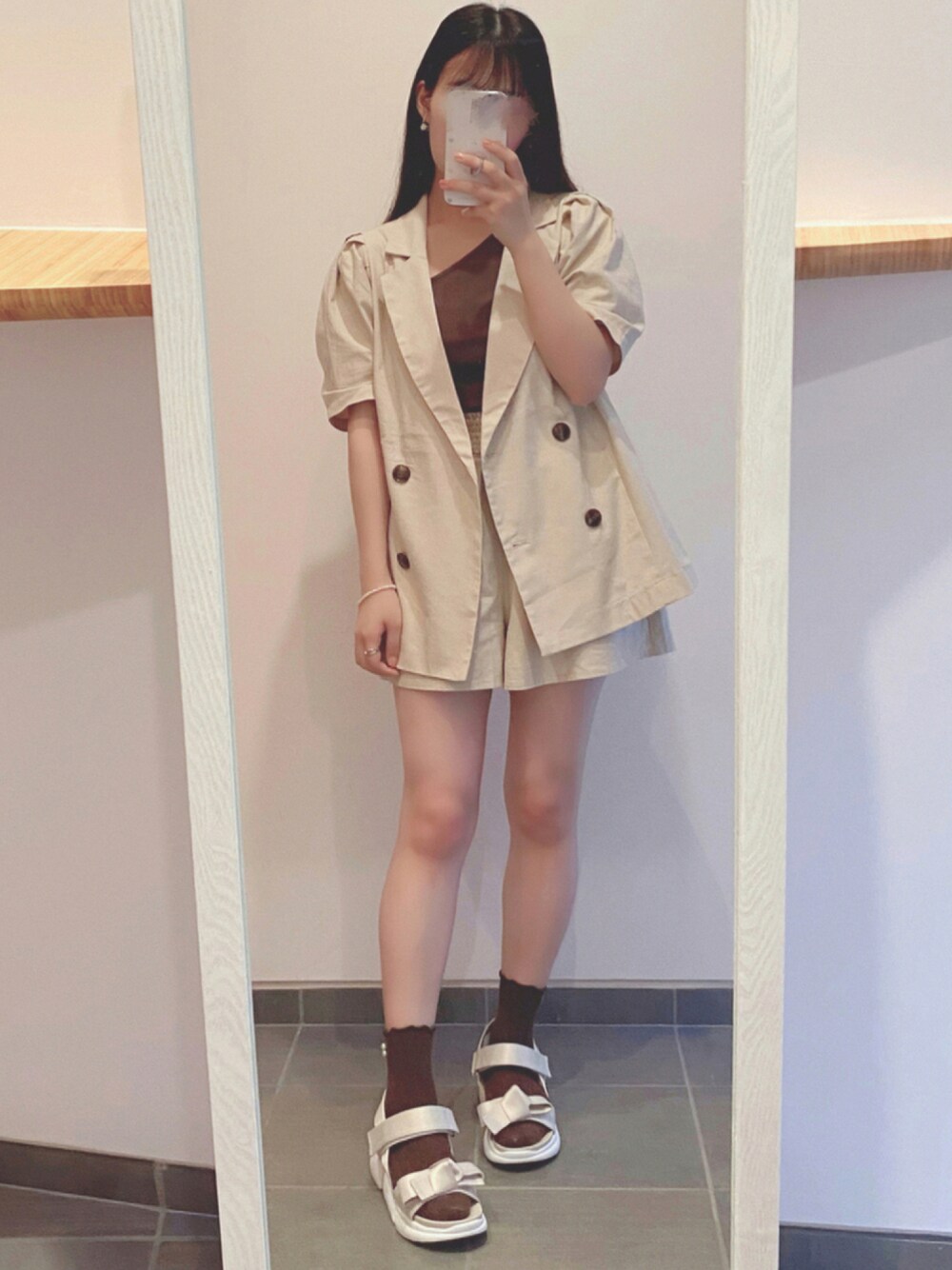 🍪🐻 こんにちは✲*゚ ❥beige linen set up ❥brown one shoulder tank top ❥ribbon sports sandal