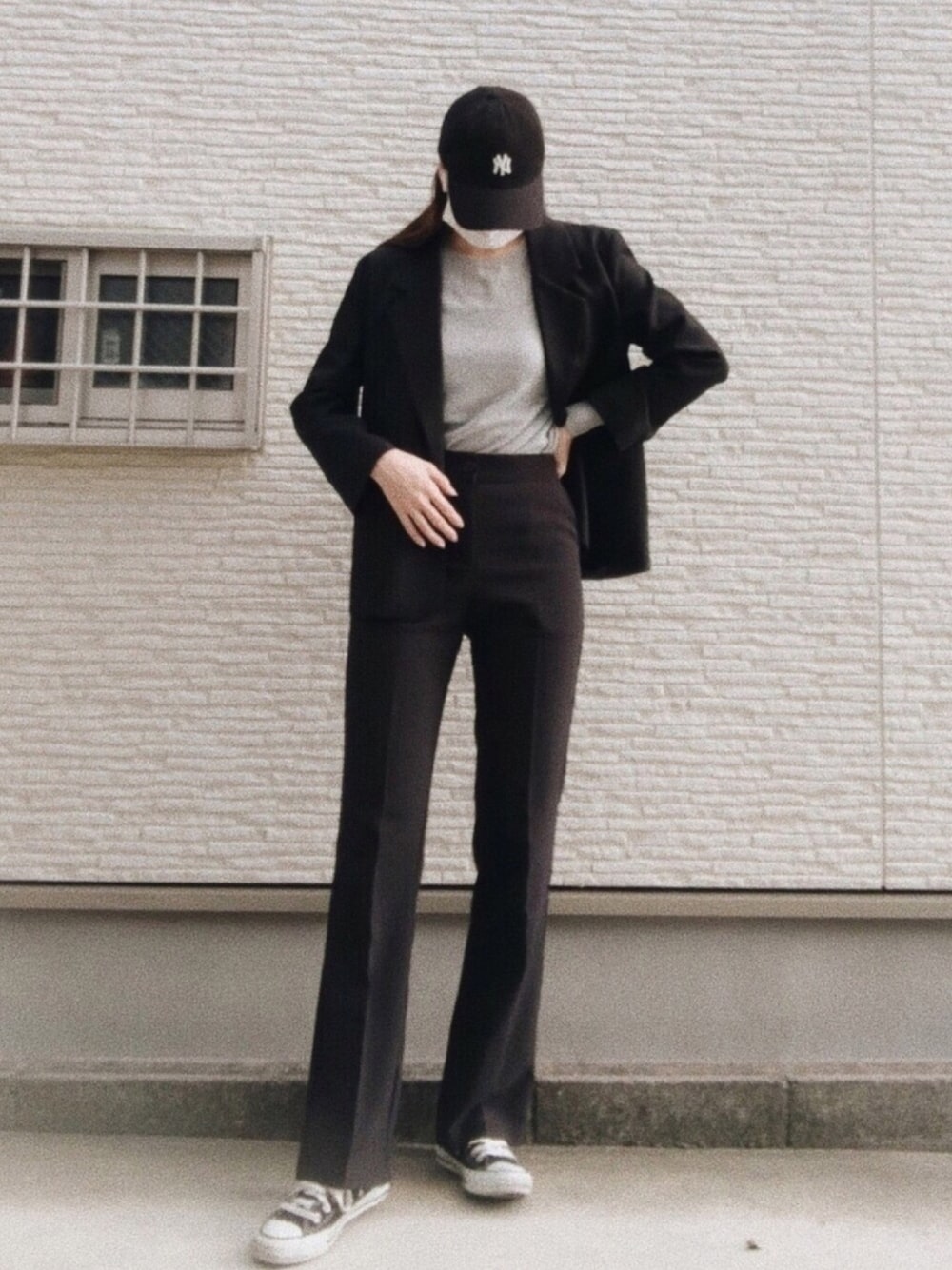 モノトーンなスタイルでも羽織ものは必須👽 gogosingのこのパンツ本当に脚長効果がすごい!!しかも絶妙なフレアで足が細く見える優れものです