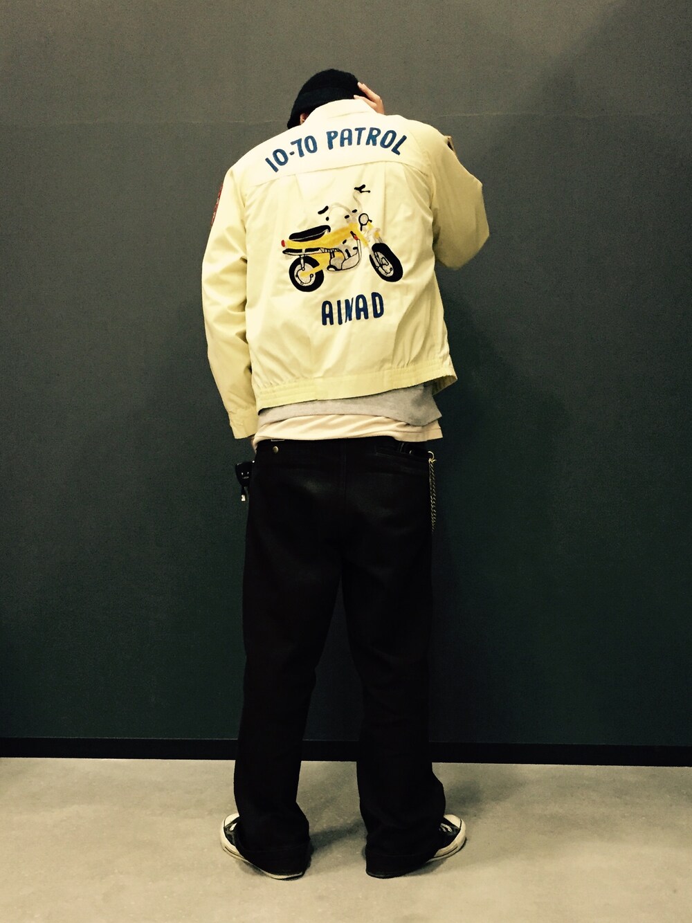 Drizzler JKT お馴染みのスイングトップです 現行でも多く販売されており、 一度は耳にしたことのあるアイテムではないでしょうか ドリズラージャケットの発祥は1940年代に 薄手のスポーツ用ジャケットとしてマクレガー社から始まりました その後用途は様々なジャンルに広がり、 モーターサイクル店の営業服としても使われました これもその類のひとつと推測されます バックには ポップに描かれた刺繍バイクと住所、店名を背負っています 夏服で言うところの レイヨンボウリングシャツとほぼ同価格帯と 安価でありながら、 こういったバックで遊べるものが多いです ただ着丈が短いため、正直合わせにくいです… いいコーデ案があれば是非教えて下さい