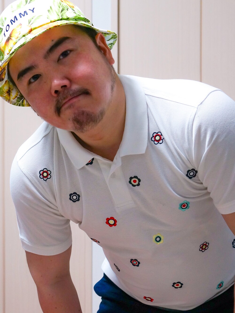 個性的なトロピカル柄を選びました。 ポロシャツも花をキーワードに、サイズは小さめ。ショーツも丈を短いのを選ぶと、今っぽくなりました。