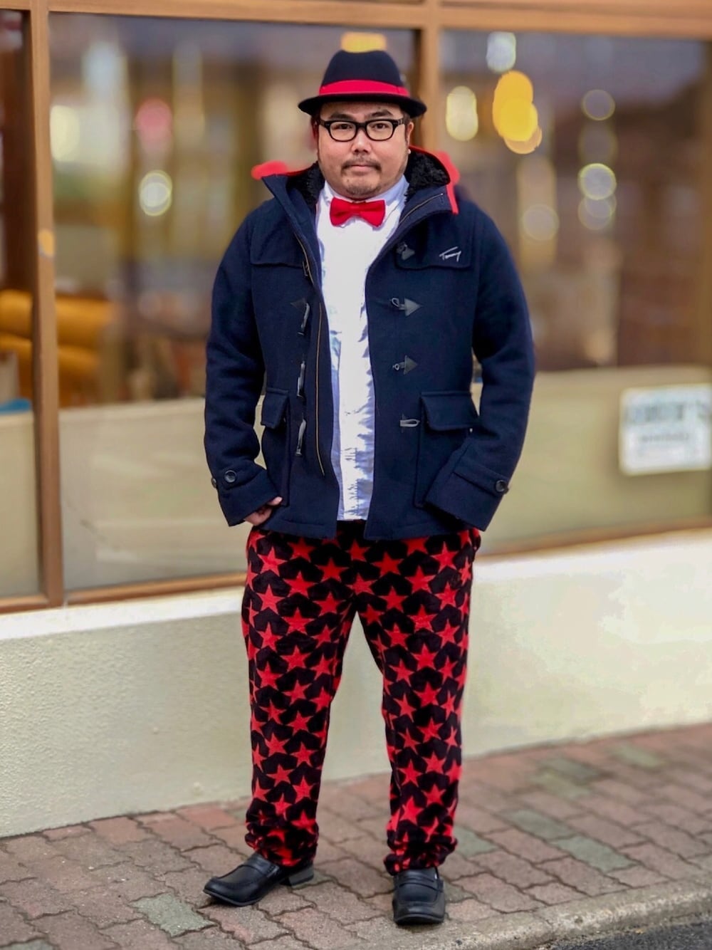 クリスマスコーデです コスチュームぽい個性派パンツはこの時期だからこそ使えるし映える!穿いたもん勝ち! 上半身はその分、シンプルに赤いラインや蝶ネクタイをアクセントにしました メリークリスマス!
