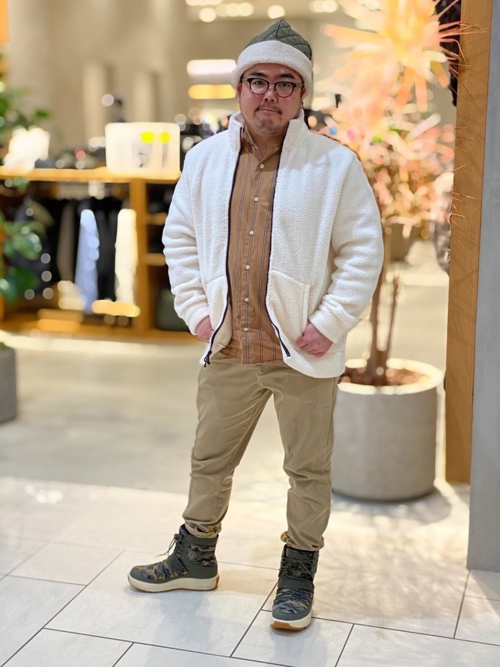 カジュアルな休日スタイルに、帽子やブーツをミリタリーテイストでミックスすることで綺麗さの中にもアウトドアな要素のあるコーデになりました。アウターのボアは大きめが良いです!