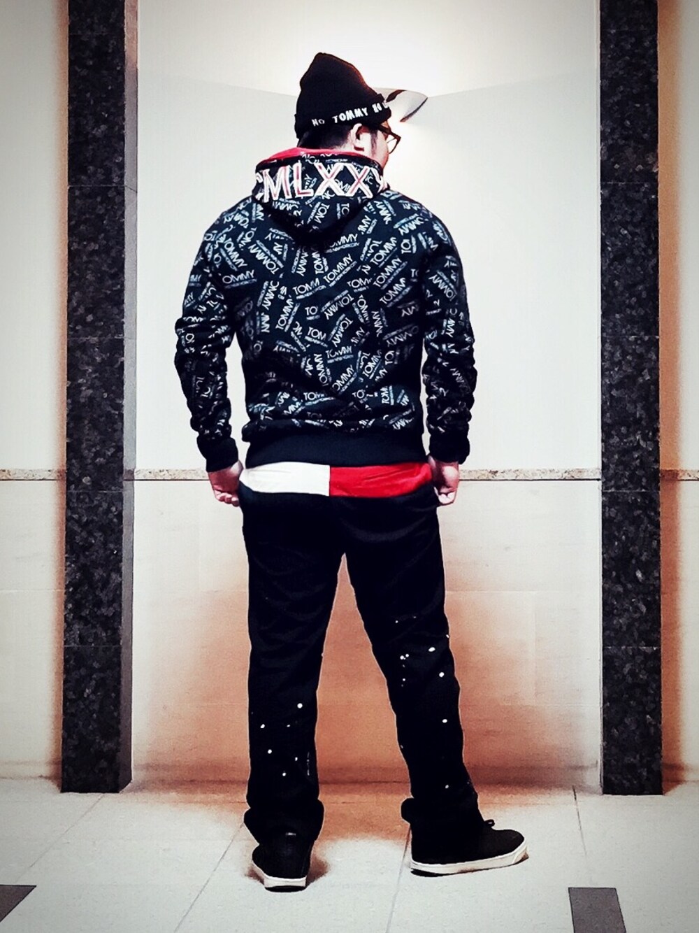 NO TOMMY NO LIFE 全てブラックにしましたがグレーのパンツと悩みむした。またキャップでも良いかも知れない。色々バリエーション選べますね〜 パーカの主張が超激しいので、チノはシンプルにサイズダウンでピッチリしたのを選びました。