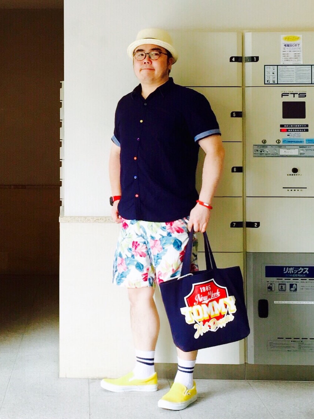 天然草のポークパイと鼈甲色のメガネはヘビロテしてます。 BEAMSのマルチカラーボタンのシャツは前から気に掛けてたのでセールで購入できてラッキーでした! トップスがシンプルなのでパンツを花柄にして、イエローのスリッポンを履いてバランスを気にしながら夏らしくしました。 誕生日プレゼントでいただいたUP24が赤だったのでTommyとG-SHOCKコラボの腕時計をつけました。