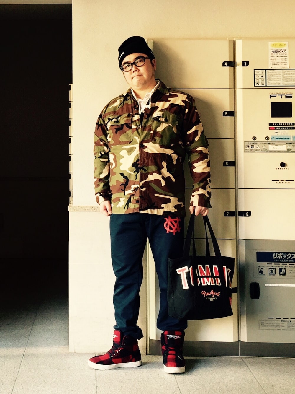 迷彩ジャケットを先に選んでコーディネートをしてみました。 ジャケットの中は白いボタンダウンシャツと黒いカーディガンを着ています。ピンクのシャツにしたり、赤かオレンジのパーカーを出しても良いと思います。 ボトムスとスニーカーとトートバッグの赤を合わせてみました。ボトムスは黒でも良いと思いますが少し明るくしたかったので濃紺を選びました。