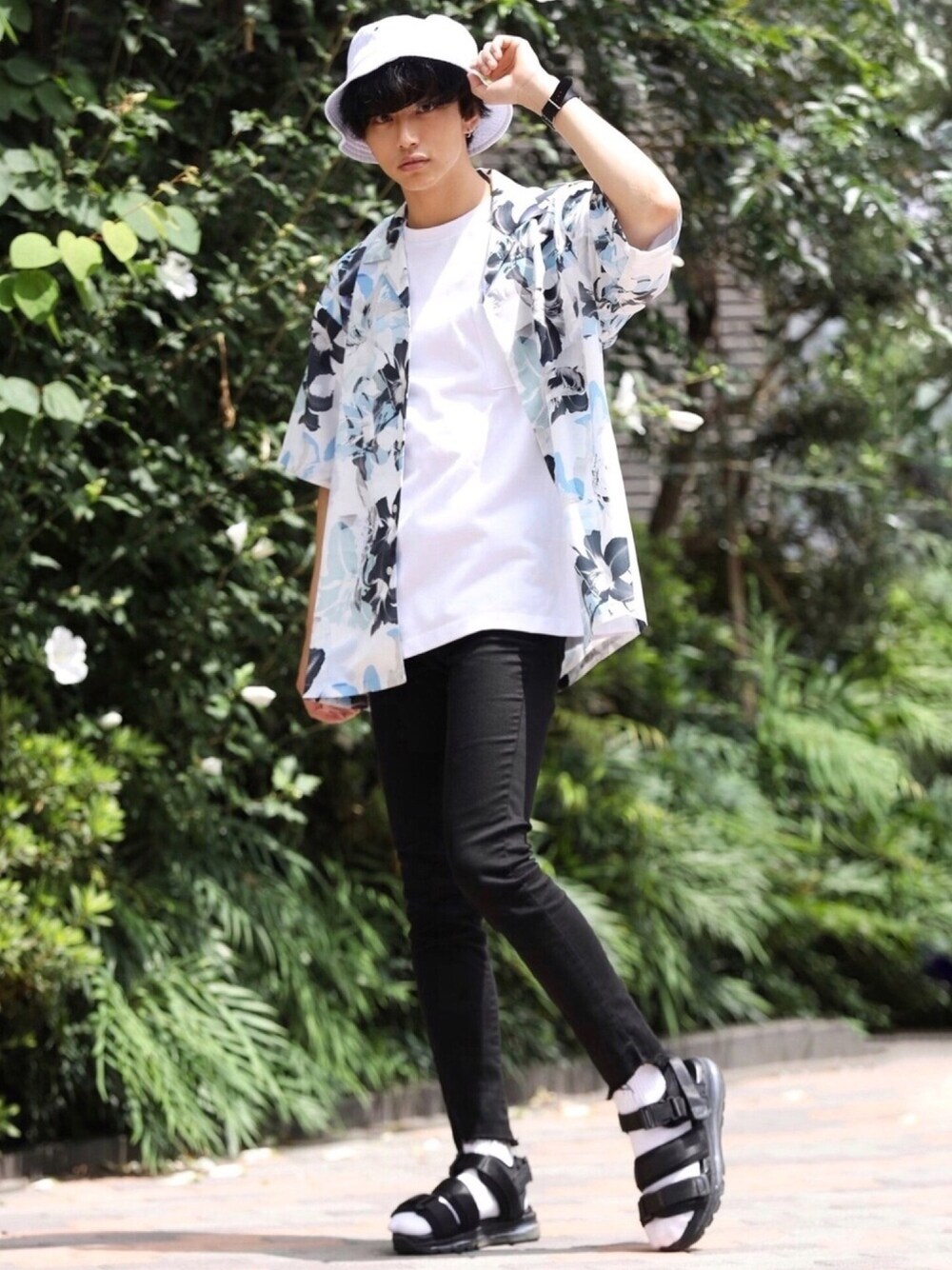 おはようございます☀ いつもいいね・お気に入りありがとうございます! RAGEBLUEのシャツを使ったコーデです! 夏っぽいアロハシャツとバケハとサンダルの三点セットは相性抜群🥺 黒スキニーと合わせるとVラインシルエット完成😉 TwitterとInstagramとTikTokとYouTubeもやっているのでフォローお願いします🥺 Twitter→@1keiNo Instagram→@k_e_i.stagram TikTok→k_e_i.stagram YouTubeチャンネル名→渋谷サーキュレーション