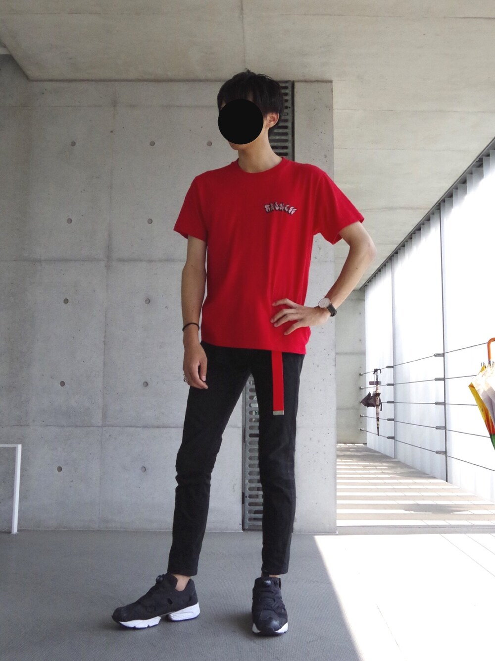 赤のTシャツとガチャベルで色合わせしたコーデです! 赤と黒のツートーンで纏めました^ ^ ガチャベルは持っていると使えますね笑 この夏、アバハウスで買ったポンプは大活躍してます😎