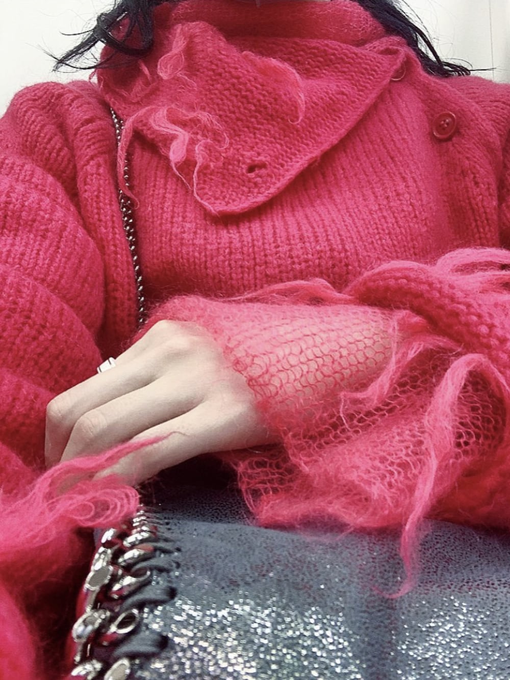 透け感のある天竺編みニットとの2重構造が繊細で可愛いし裏返すと透けたニットの中に毛足の長い編み地が内側にあるからより重なり合った印象になって可愛いしなんならキッドモヘアだから暖かいし3WAYで使えるし完璧すぎもう一度言う可愛い