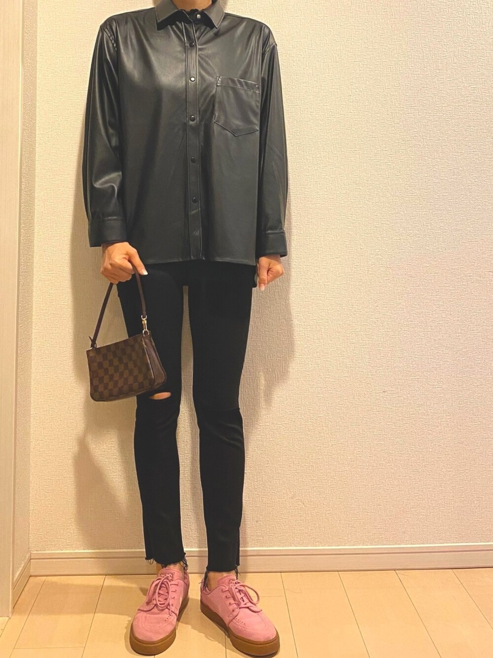 探しまくって やっと理想の形を見つけた お気に入りのレザーシャツ︎︎︎︎︎︎︎︎☺︎︎︎︎︎☺︎ レザーにダミエ柄ってぴったり𖤣𖥧𖥣。𖥧 スニーカーはpinkで女の子ぽく𓈒𓂂𓏸