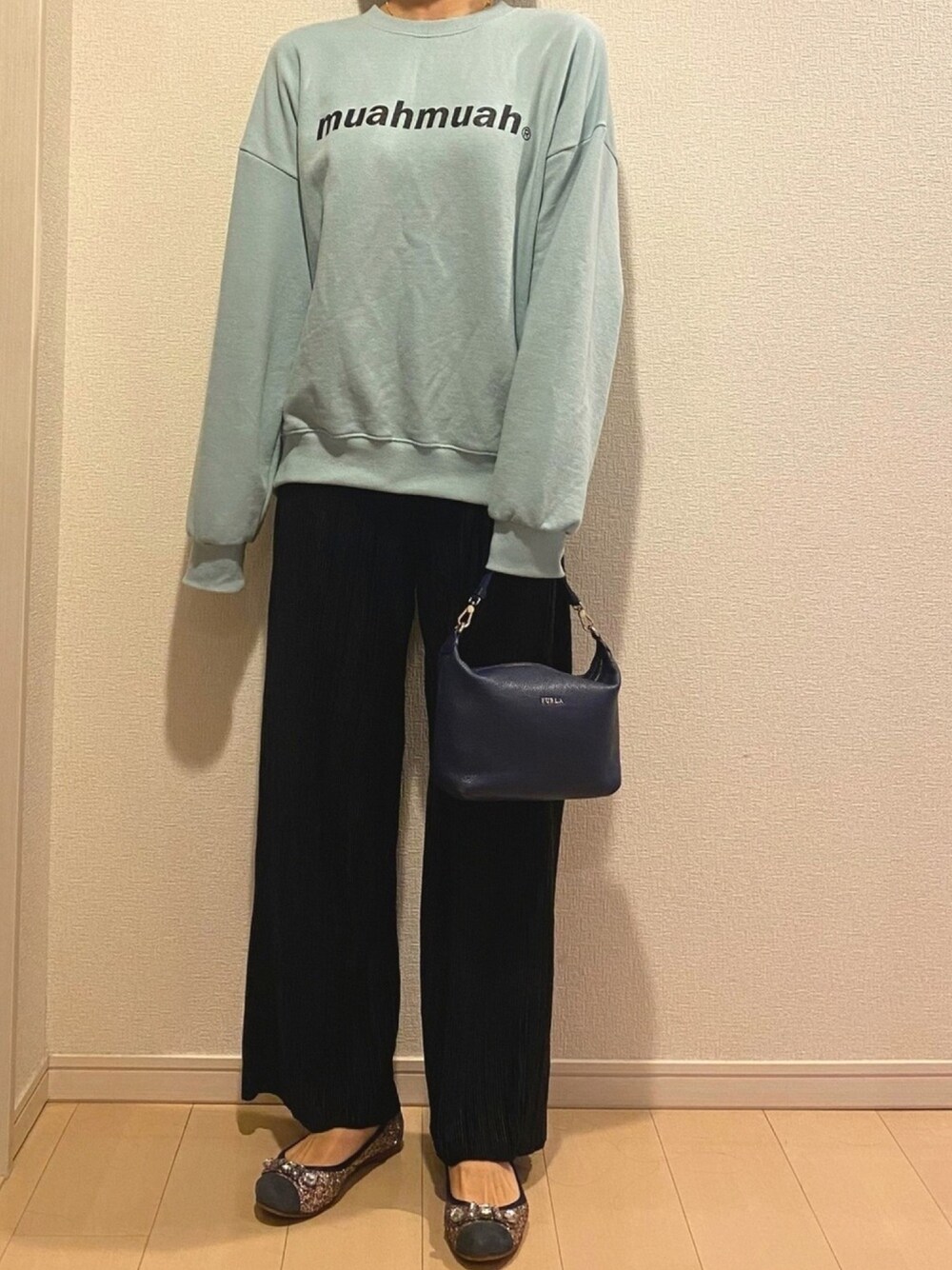 色味に一目惚れの… muahmuahのスウェット𓈒𓂂𓏸 何ともいえない このミントグリーンが可愛いすぎる。 色味に合わせて、綺麗目になるように 小物はネイビーでまとめて❁⃘*.゚ 雨の日ゆるゆるコーデ⋆☽︎︎·̩͙