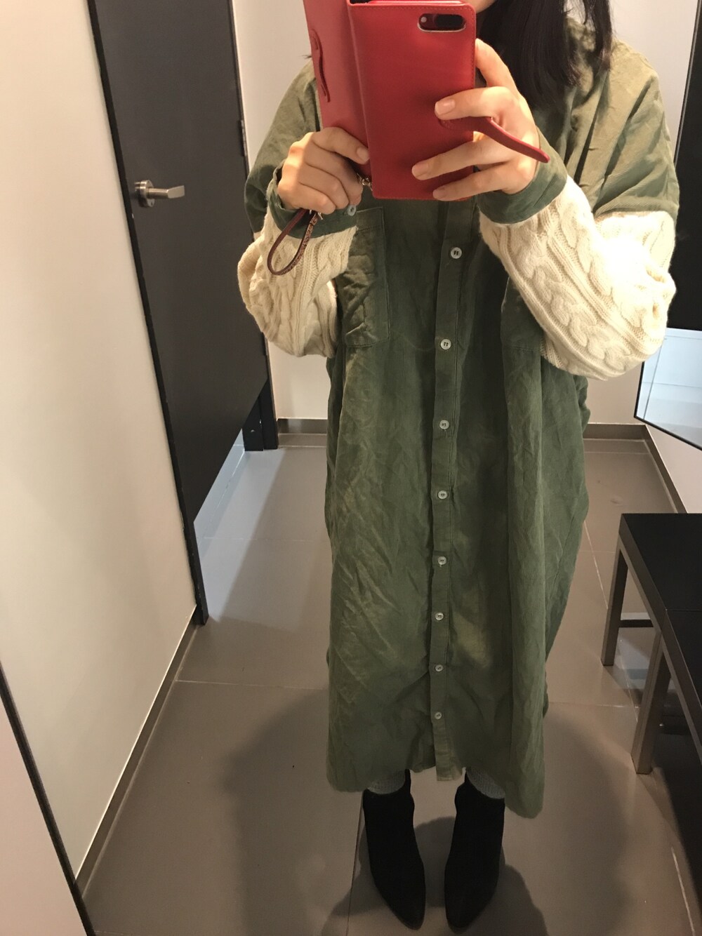 いつまでも好きなワンピース着てたら完全に浮いてたのでリラックス系シャツワンピを着てみた。袖ニットで暖かいです。