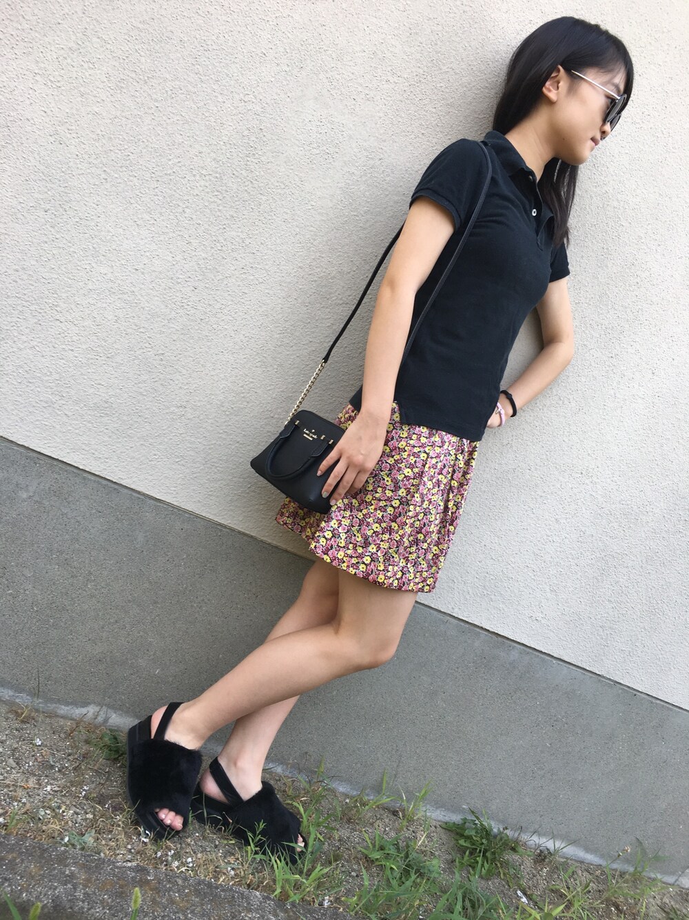 実はスカートに見えるのがズボンなんです。 ボトムスの花柄とアクセサリーの色を揃えました。 スポーティになりすぎないようにブランドバッグで少しドレスアップしています。