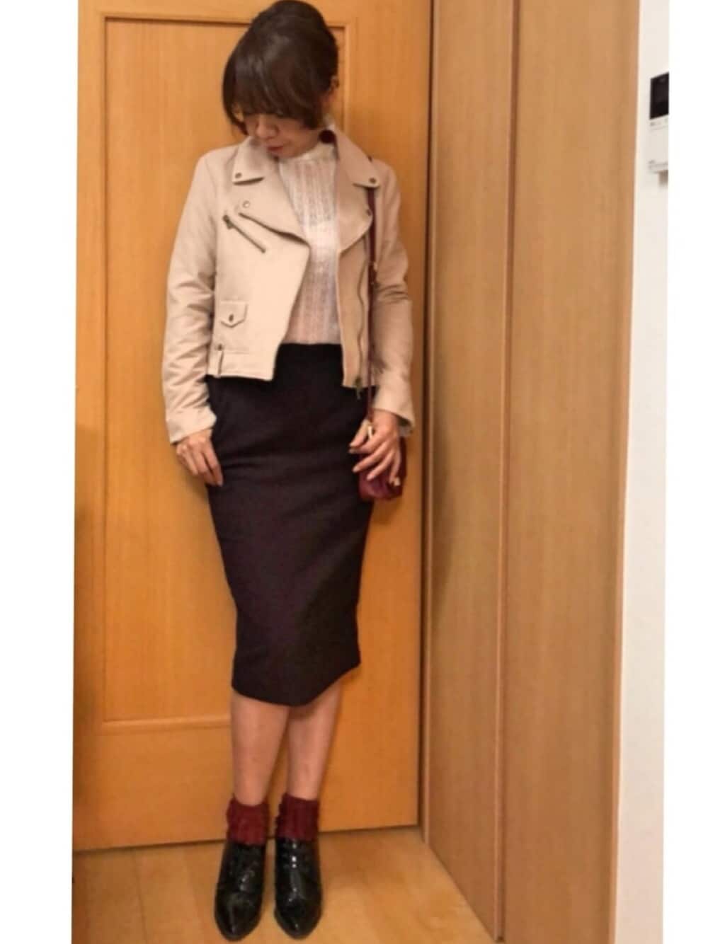 この前のイングのアイボリーのライダース ダメにしてしまったの😨😰 すごいお気に入りだったのに青いシミが浮き出てきて 雨の日ゎ濡れても大丈夫な羽織がいいですね、雨が多くて今年ゎ 足元とかも悩みますよね😥 それで見えにくいですがピンクベージュの スエード素材でとても軽いライダース購入😍へビロテ間違いなし👍✨ ボルドーのUNIQLOのペンシルタイトこれ形とってもセクシーです😍 ボルドー&ピンクコーデです、小物を全てボルドーに足元だけ黒にして見ました😜 かわゆい方々のフォルダ作ったので覗いてください✨🎵 週末台風かな 気をつけましょうね でゎ楽しい週末を✨