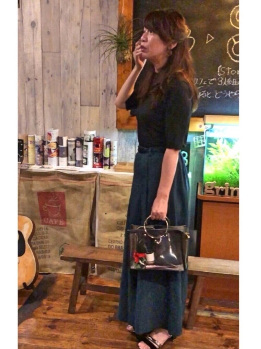 見えにくいですがごめんなさい🙏✨ オシャレなカフェに行ってきました☕️ 色だけでも秋コーデ 緑&黒です✨ ななちゃんに貰ったピアスが又合う❤️ 自己満でm(_ _)m✨
