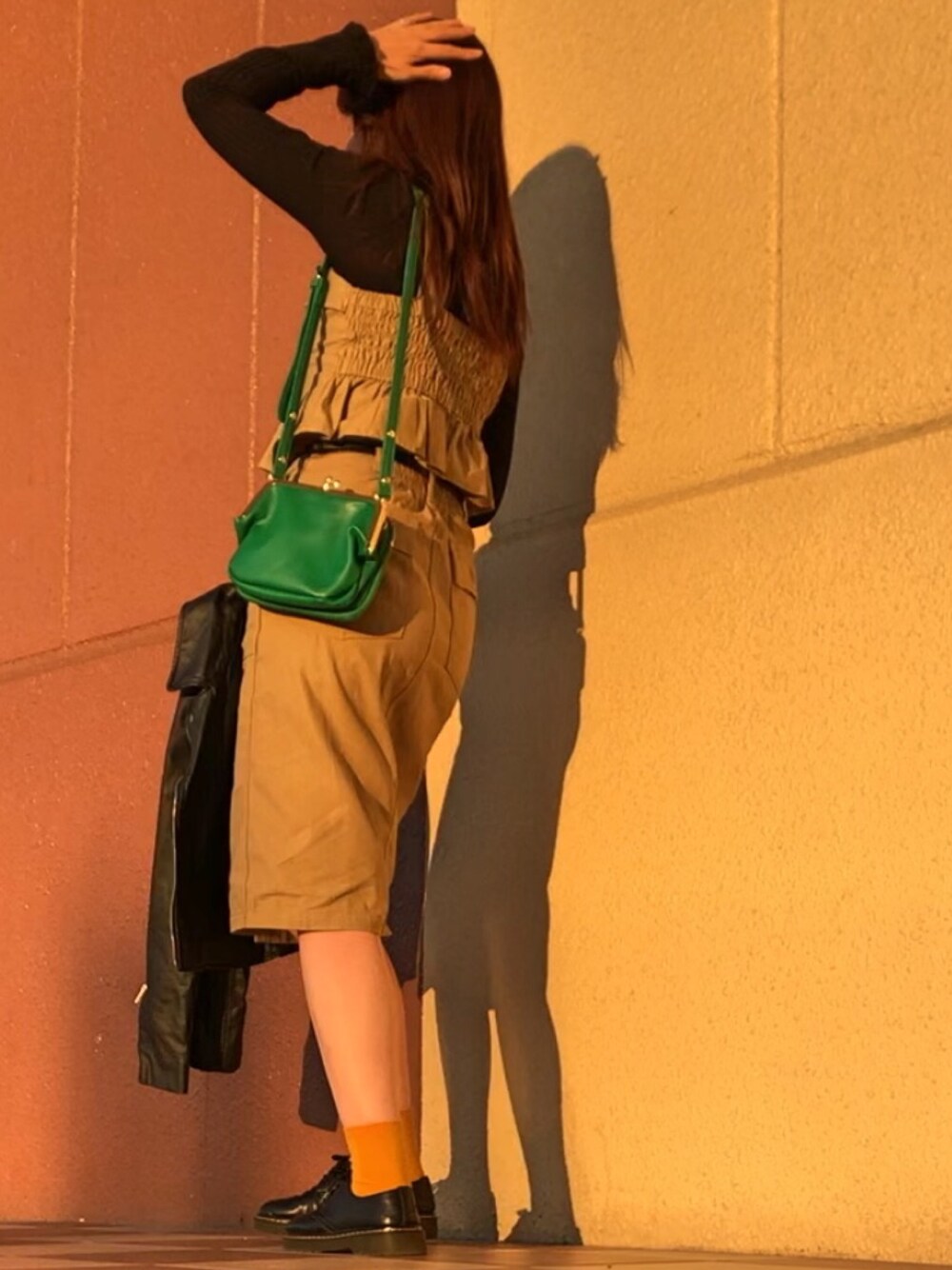 夕陽で色味がわかりにくい🌇 今日はかわゆいあっちゃんと イロチのバッグおろしてみました💕 カエル色w あっちゃんが持ってると何もかもが可愛く見える❤️ おばさんだとこんな感じ🤣🤣 しまむらのセットアップ可愛すぎて ビスチエおろしてなかったので⤴️😄☺️ ライダース持ってみたの✨ 今週もよろしくお願いします🤲✨