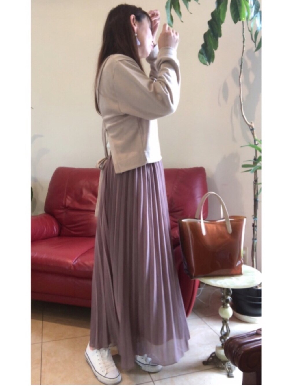今日は美容室に子守に来ました✨ 👶寝かせてミルクです👶🍼 大丈夫かな🙆♀️ 子も生んでない中年なんです👶 さっき寝てたのに また起きました お腹すいたのかな? ミルク作らんと💦 今日はモカ色のプリーツスカート 丈感も色もお気に入り♬ 少し光の加減で紫色に見えますが、