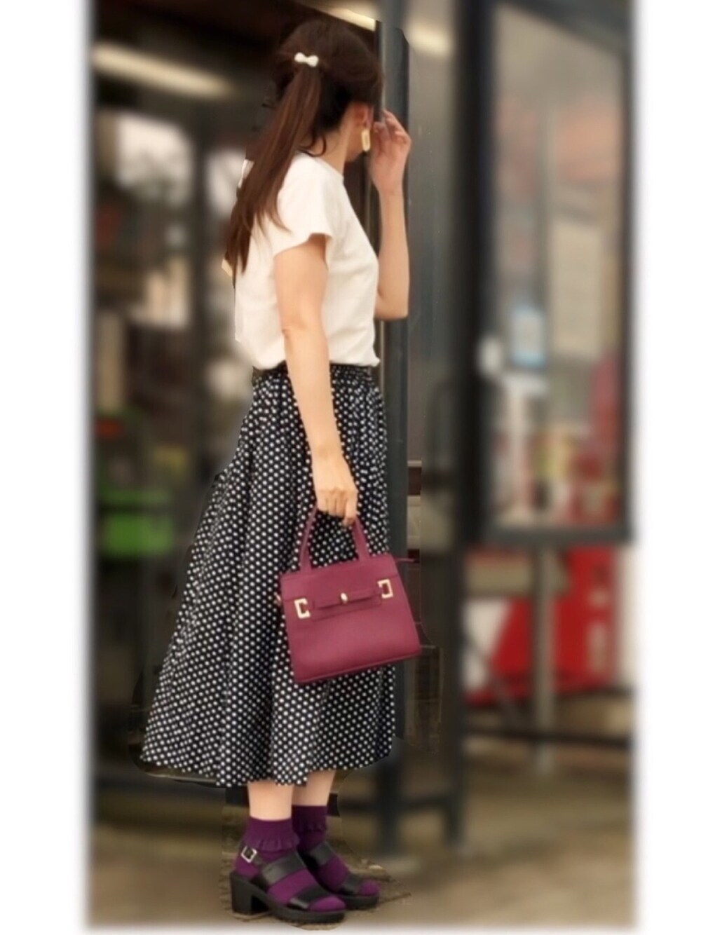 今日は水玉スカート💛 すいません着まわしです💦 突然の雨☔️ 洗濯物出先で諦めた まだ用事が済まないし🤣 それにしてもかなりの豪雨☔️ サンダルに靴下🧦 差し色でバッグも靴下もピアスも紫👜 少し濃さが違くて残念🙍♀️💧 このバッグが持ちたかった👜❤️ それとwear official様フォルダありがとうございました😊❤️
