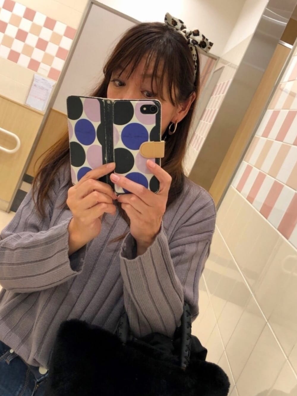 すいません また近くて💧 スマホケースもそろそろ替え時🤣 リアル〜🤭 このリブニットの色味が大人可愛いの💕 伝わらない💧 もぅすこし紫色なんだけど上手く写せなかった💦 そして頭にスカーフ 頭おかしくないよ😆 シンプルにデニム合わせだったので 頭にレオパ、パァ✋じゃないよ🤣 しかめ面でごめんなさい🙏
