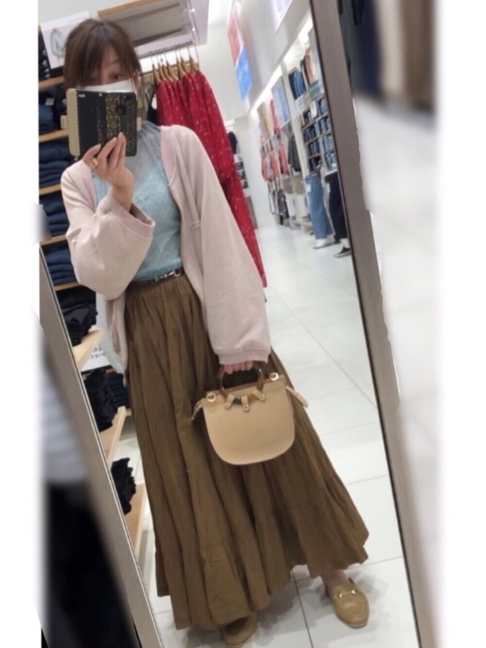 UNIQLOより 鏡撮り だいぶ斜め🤣 今日はアウターとバッグ以外全て おニューです☺️ GUのトップスやっときれた☺️ ティアードスカートは田中亜希子さんと神戸レタスとのコラボでボリューム凄い 丈感かなりあるよ、わたしが足短いのかな😆💦 それとこのバブーシュ 素材ラタン素材 涼しげ💕かわいい❤️ ウエストマークして細見え狙い😆 このアウターはお気に入りで毎年この時期 きてます❤️凄く可愛いの😍